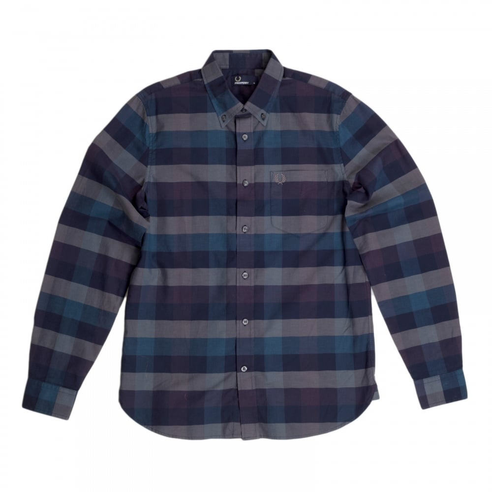 Mens Regular Fit Long Sleeve Navy Textured Gingham Shirt with Soft Button Collar by Fred Perry