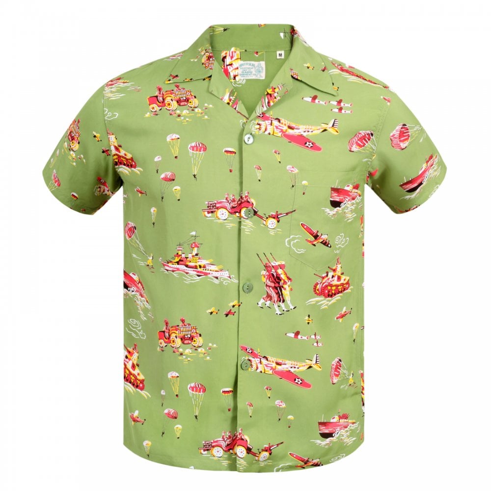 Mens Regular fit Olive Oahu History of Troops Printed SS37576 Hawaiian Shirt with Cuban collar by Sun Surf