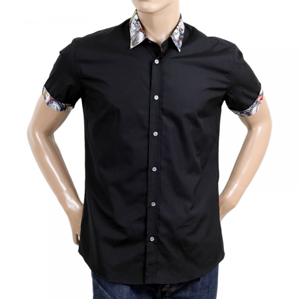 Mens Black Regular Fit Cotton Short Sleeve Shirt with Grey Embossed Logo Buttons and Soft Collar