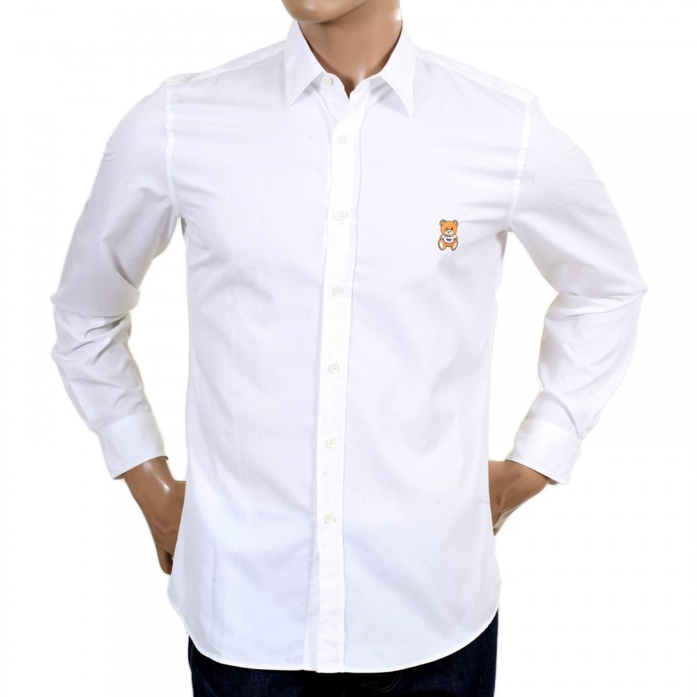 Mens White Slim Fit Long Sleeve Shirt with Teddy Bear Embroidered on Chest and Logo Embossed Buttons