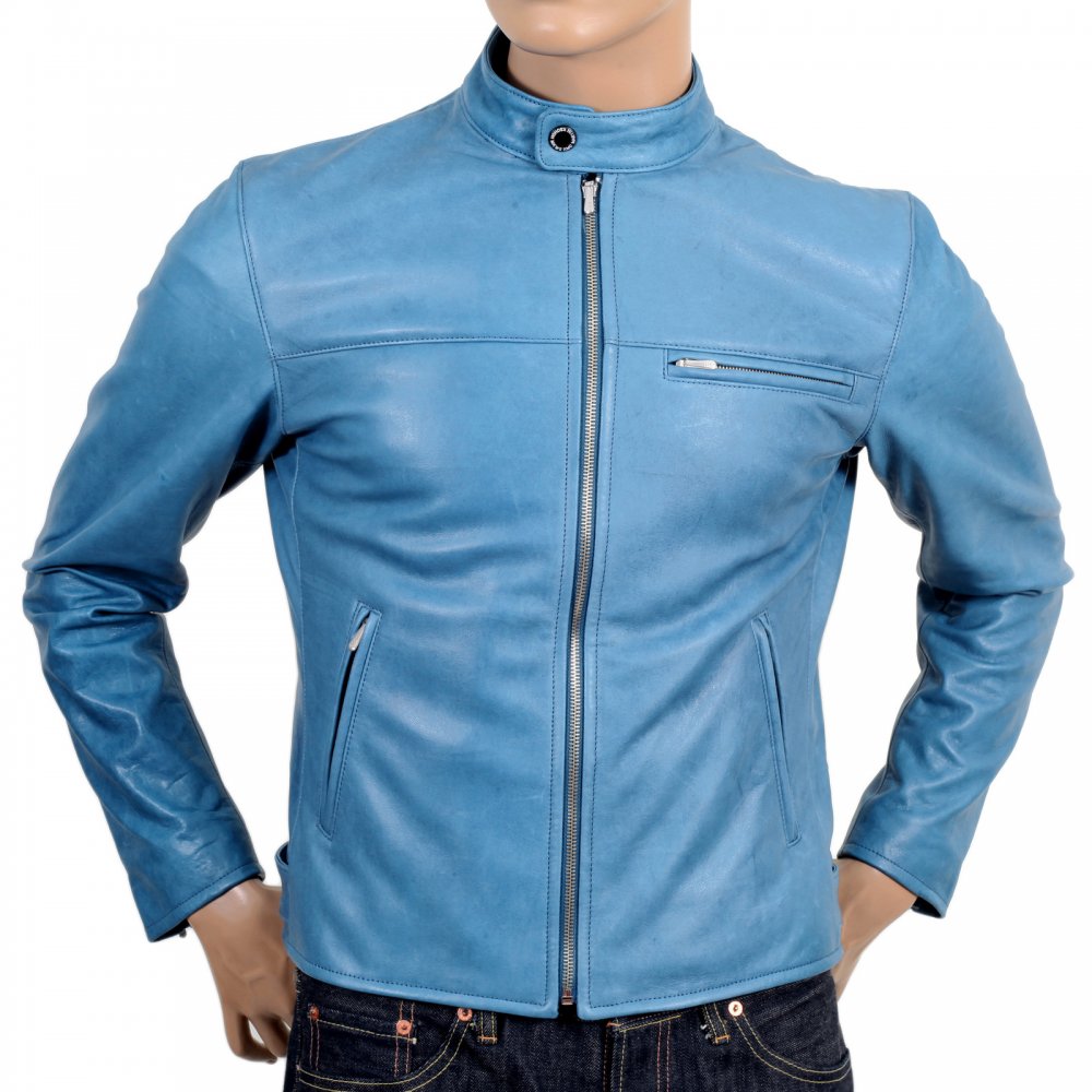 Blue Kid Leather Zipped Biker Jacket with Nehru Collar