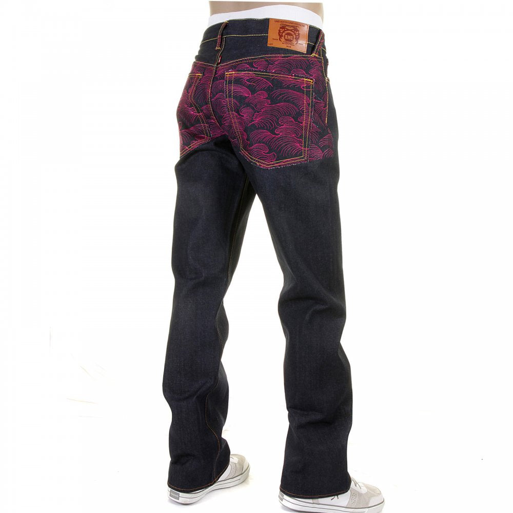 Genuine Dark Indigo Vintage Cut Raw Denim with Full Back Fuchsia Tsunami Wave Embroidery