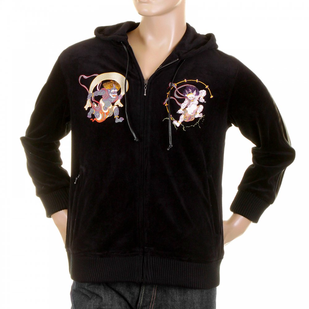 Mens Velvet Black Hooded Zip up Regular Fit Jacket with Fuiji and Raiji Embroidery