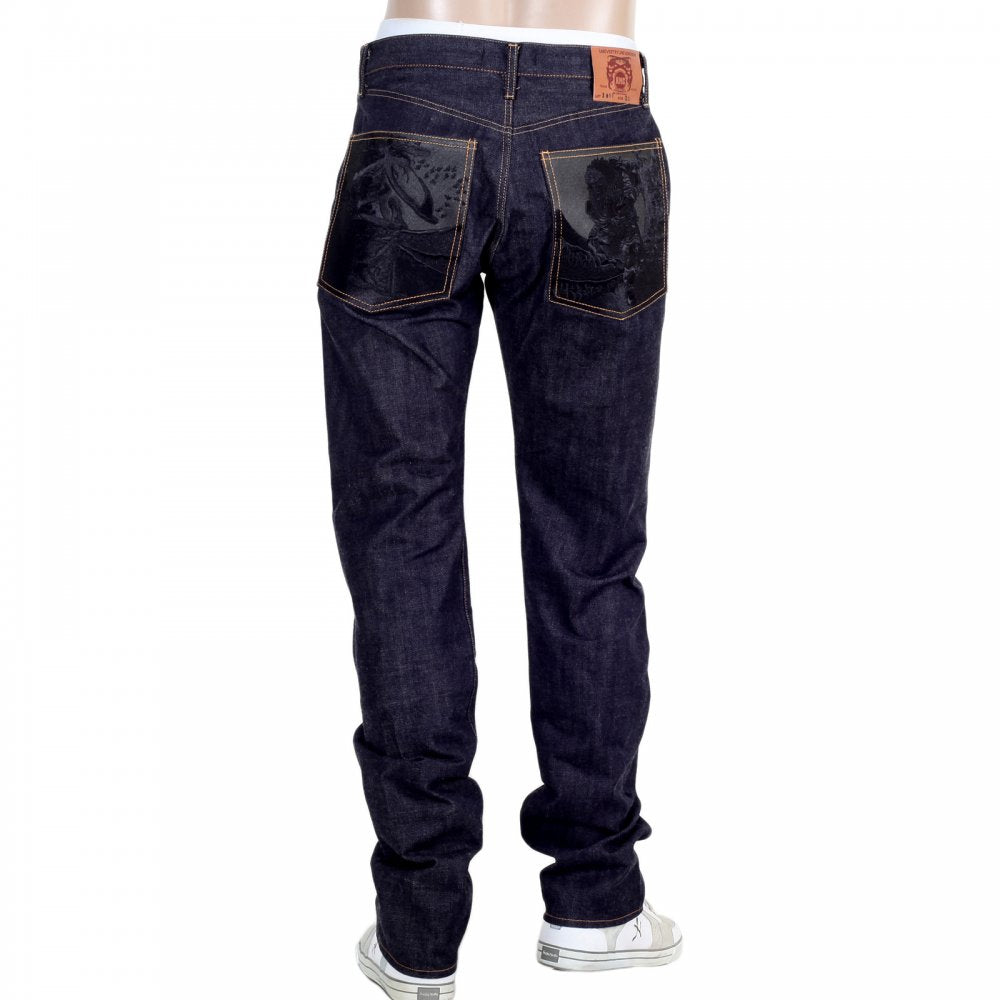 Slimmer Cut Indigo Raw Denim Selvedge Jeans for Men with Black Bushi Embroidery