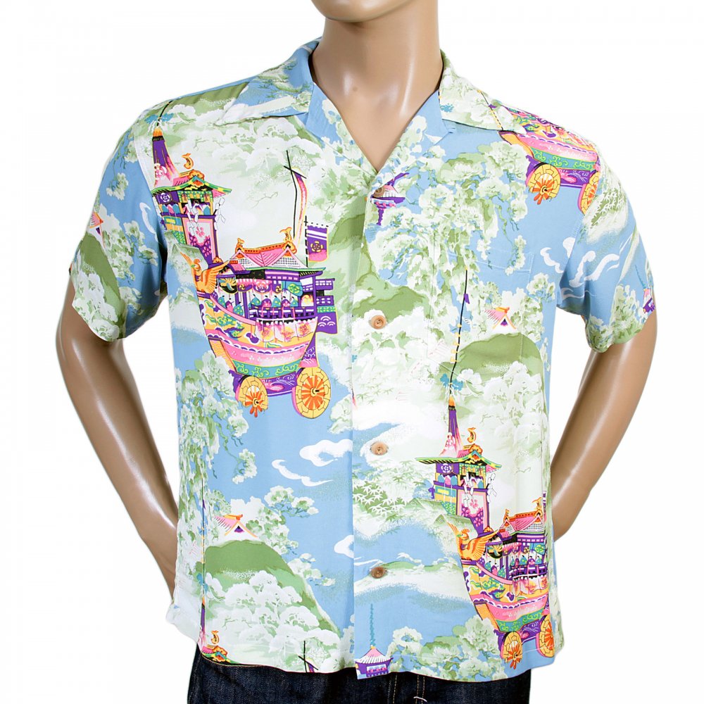 Regular Fit Short Sleeve Blue Rayon Cuban Collar Printed Gion Matsuri Hawaiian Shirt SS36431