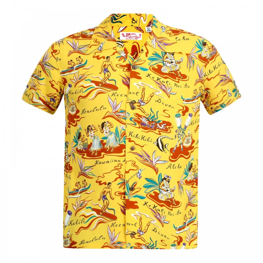 Sun Surf Regular Fit Short Sleeve SS37771 Hawaiian Hula printed Rayon Made Yellow Hawaiian Shirt for Men with Cuban Collar