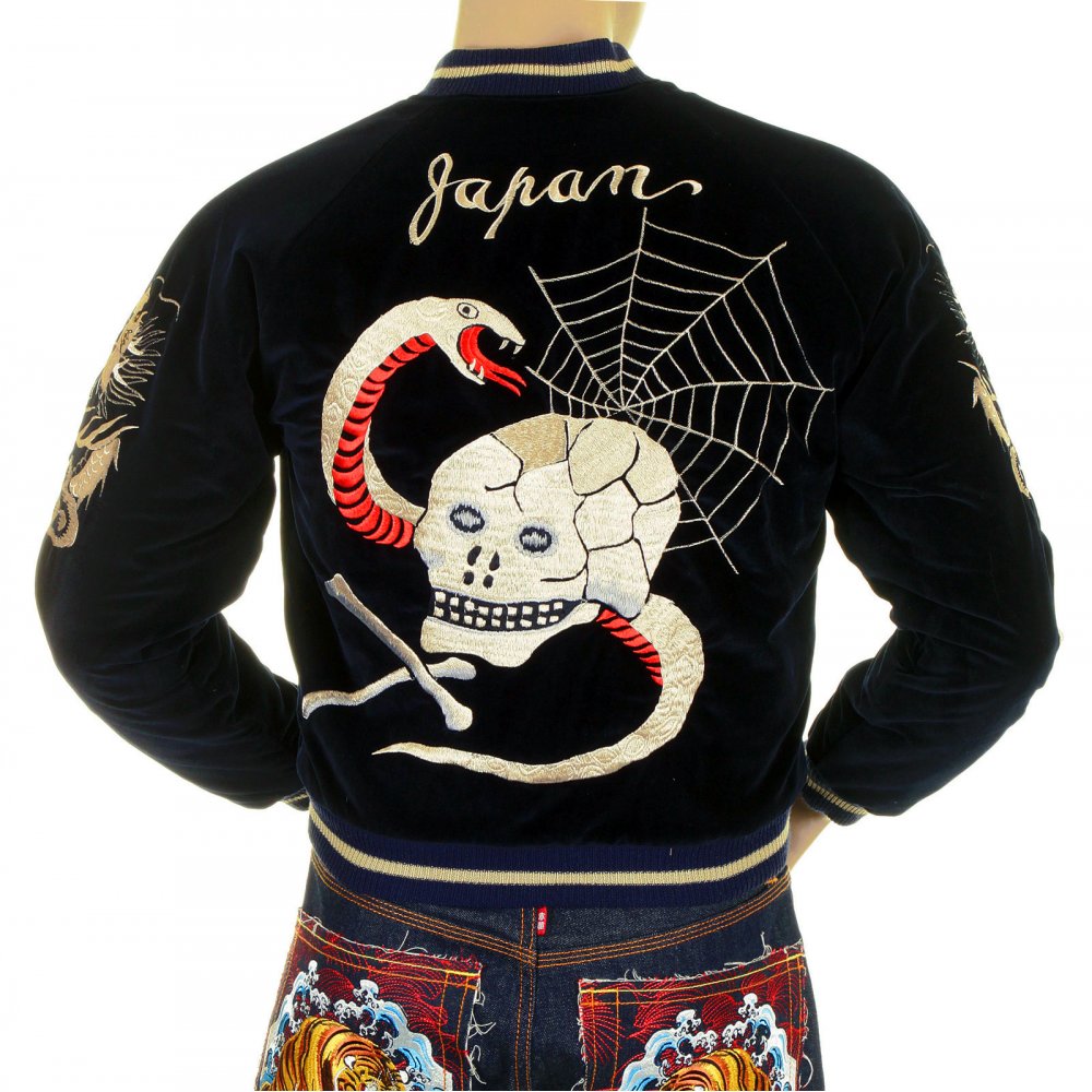 Black Fully Reversible Acetate Souvenir Velvet Suka Jacket with Skull Embroidery TT11783