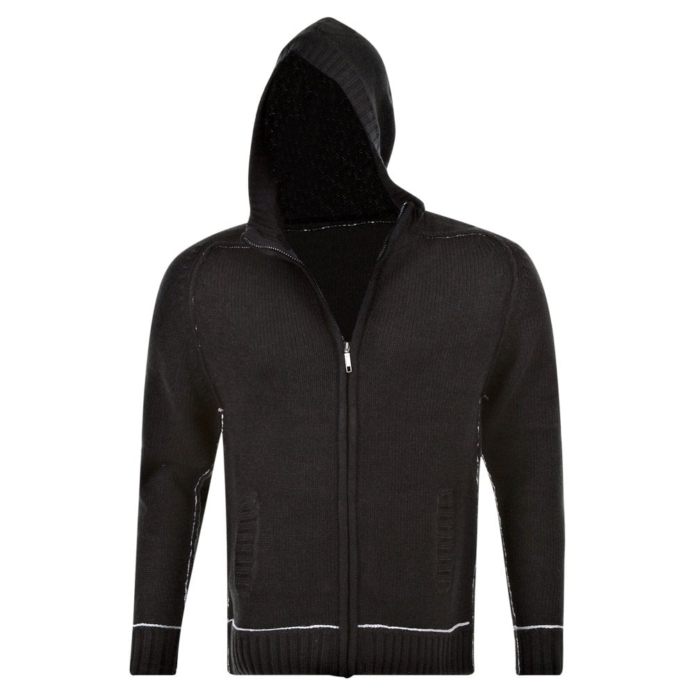 Knitted Black Long Sleeve Regular Fit Zip-Up Hooded Cardigan with Grey Trim