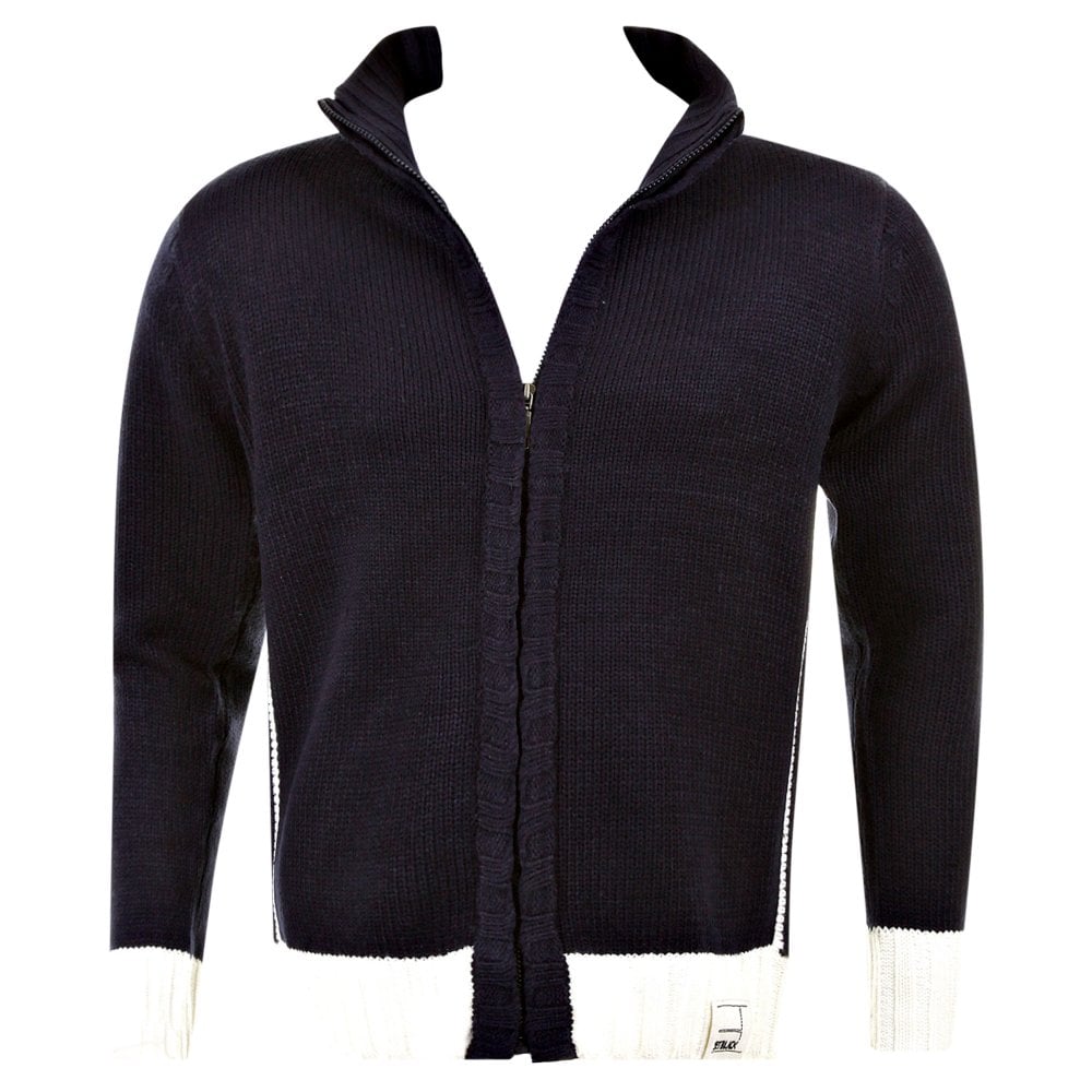 Knitted Navy Long Sleeve Regular Fit Zip up Cardigan with Ecru Trim