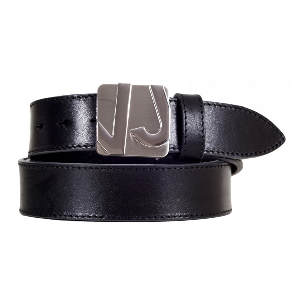 Logo Embossed Silver Pin Buckled Casual Black Leather Belt for Men with Smooth Finish