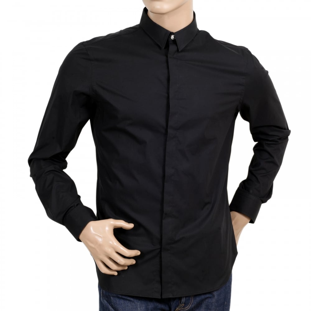 Mens Black Stretch Cotton Large Self Coloured Lion Head Embroidered Slim Fit Shirt with Soft Collar