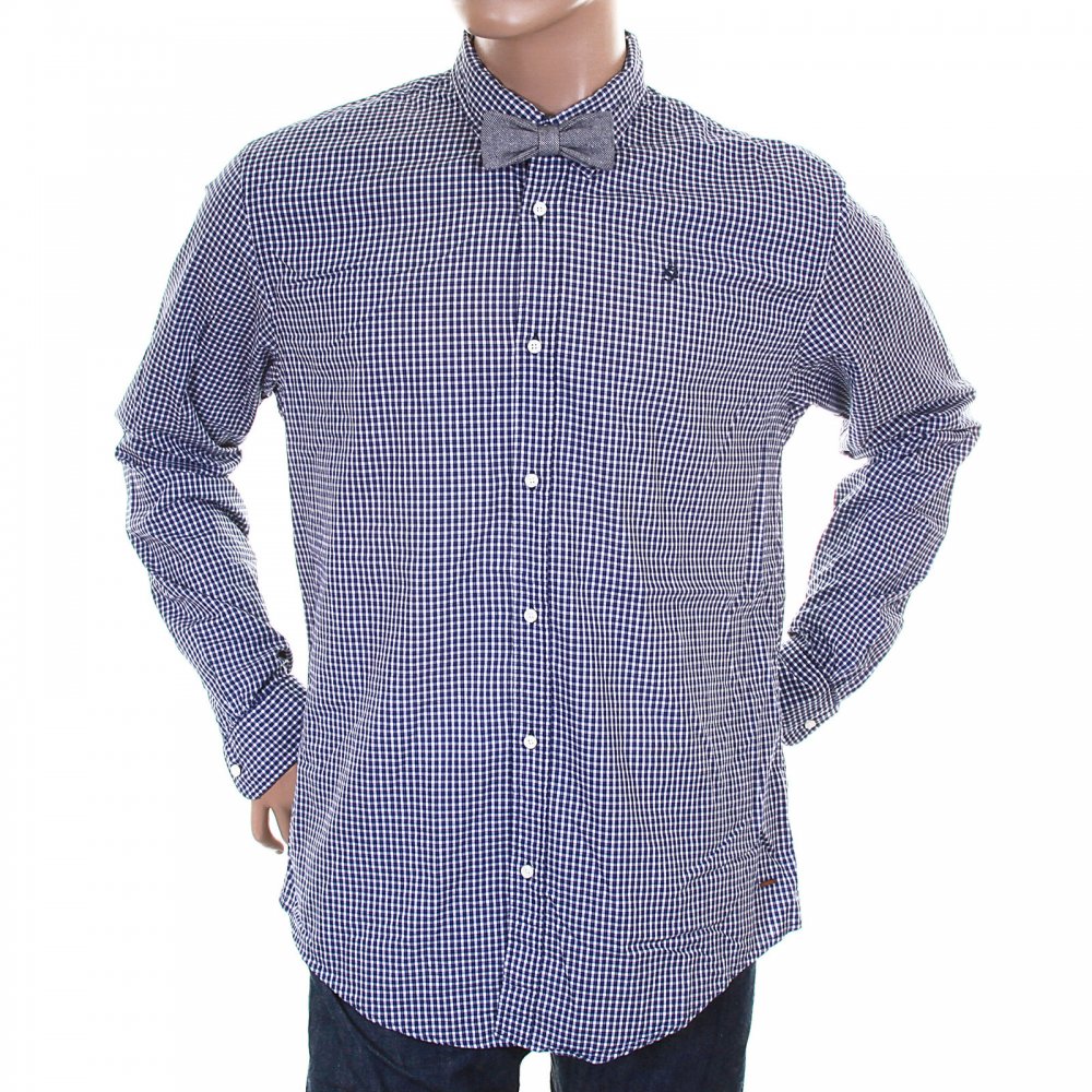 Navy and White Small Check Cotton Long Sleeve Regular Fit Shirt with Detachable Bow Tie