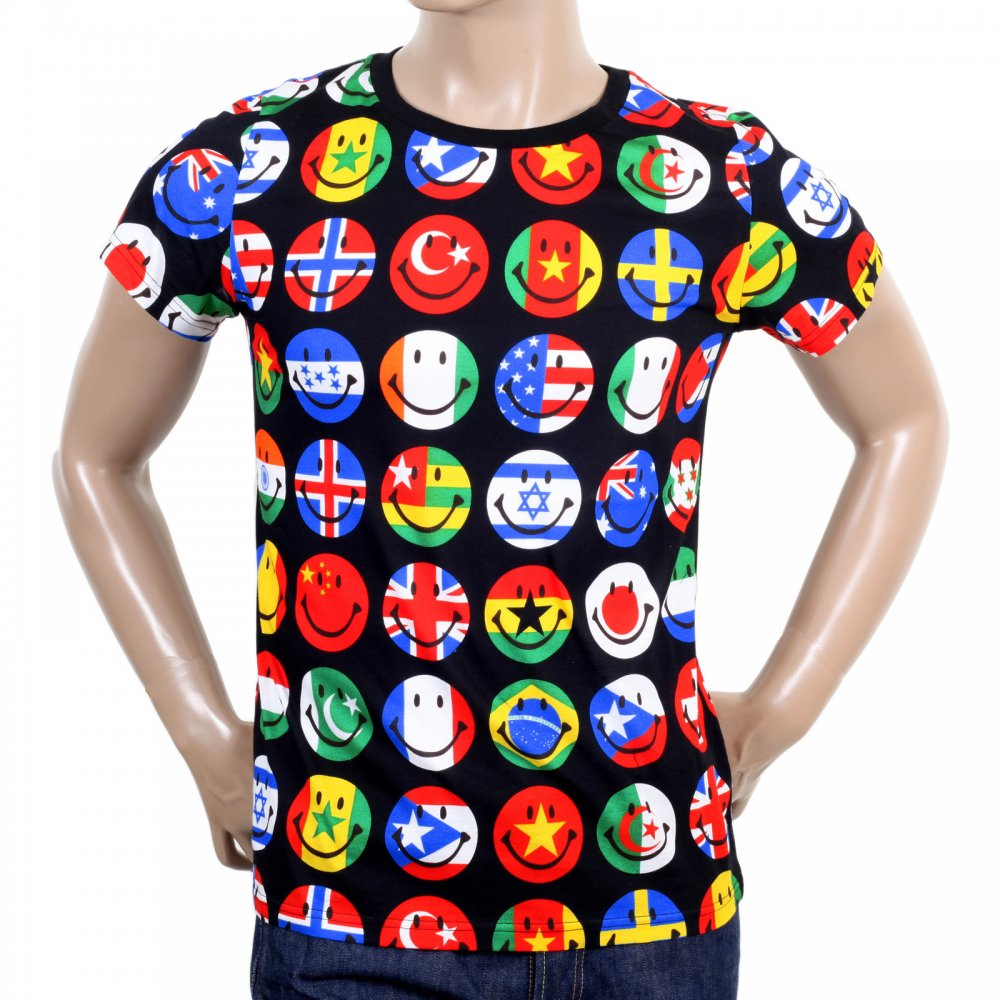 Mens Multi Color Printed Smiley Face World Flags Short Sleeve Crew Neck T-Shirt